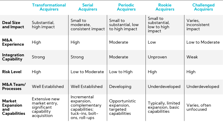 Within The Acquirers group, not all acquirers are created equal. Acquirers tend to fall within the following archetypes in the eyes of investors, which is a result of a company’s M&A objectives, history, and prowess: