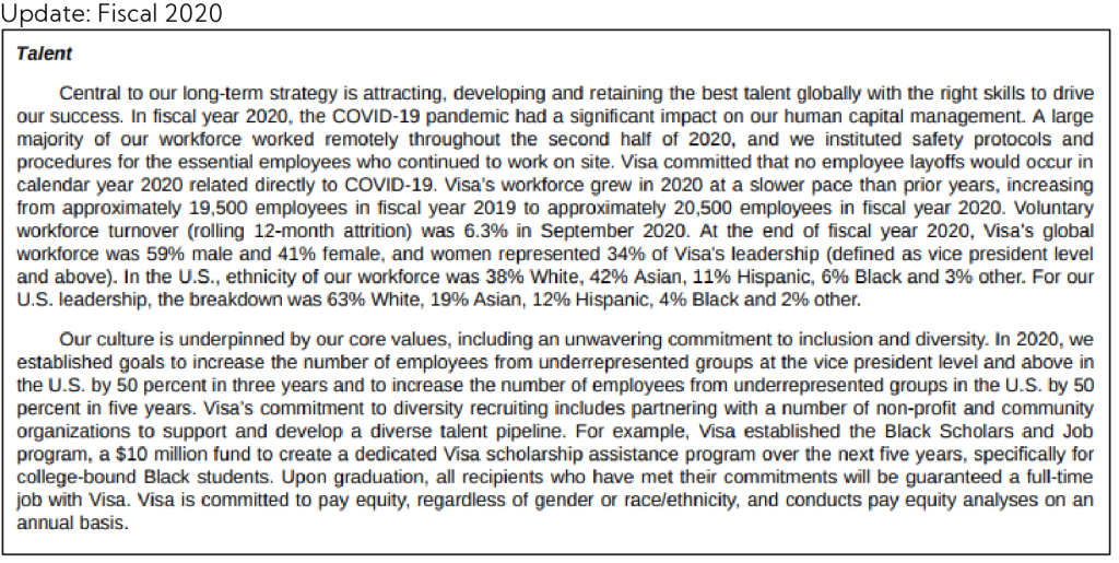 Visa’s 10-K for fiscal 2020 (year ended Sept. 30, 2020) significantly expanded its disclosure from 2019. The fiscal 2020 report discusses how human capital management and a commitment to diversity and inclusion benefit the long-term strategy and helped the company manage the impact of COVID-19. Metrics include diversity and voluntary turnover data.