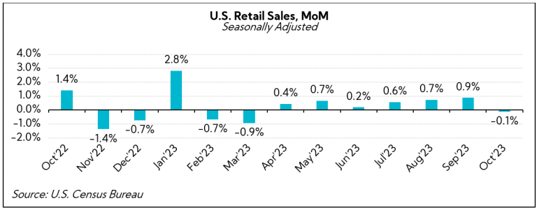 • U.S. retail sales fell 0.1% in October from a month earlier, representing the first decline since March. Contributing to the declines were reduced spending at stores, car dealerships, and gas stations. (Source: U.S. Census Bureau)